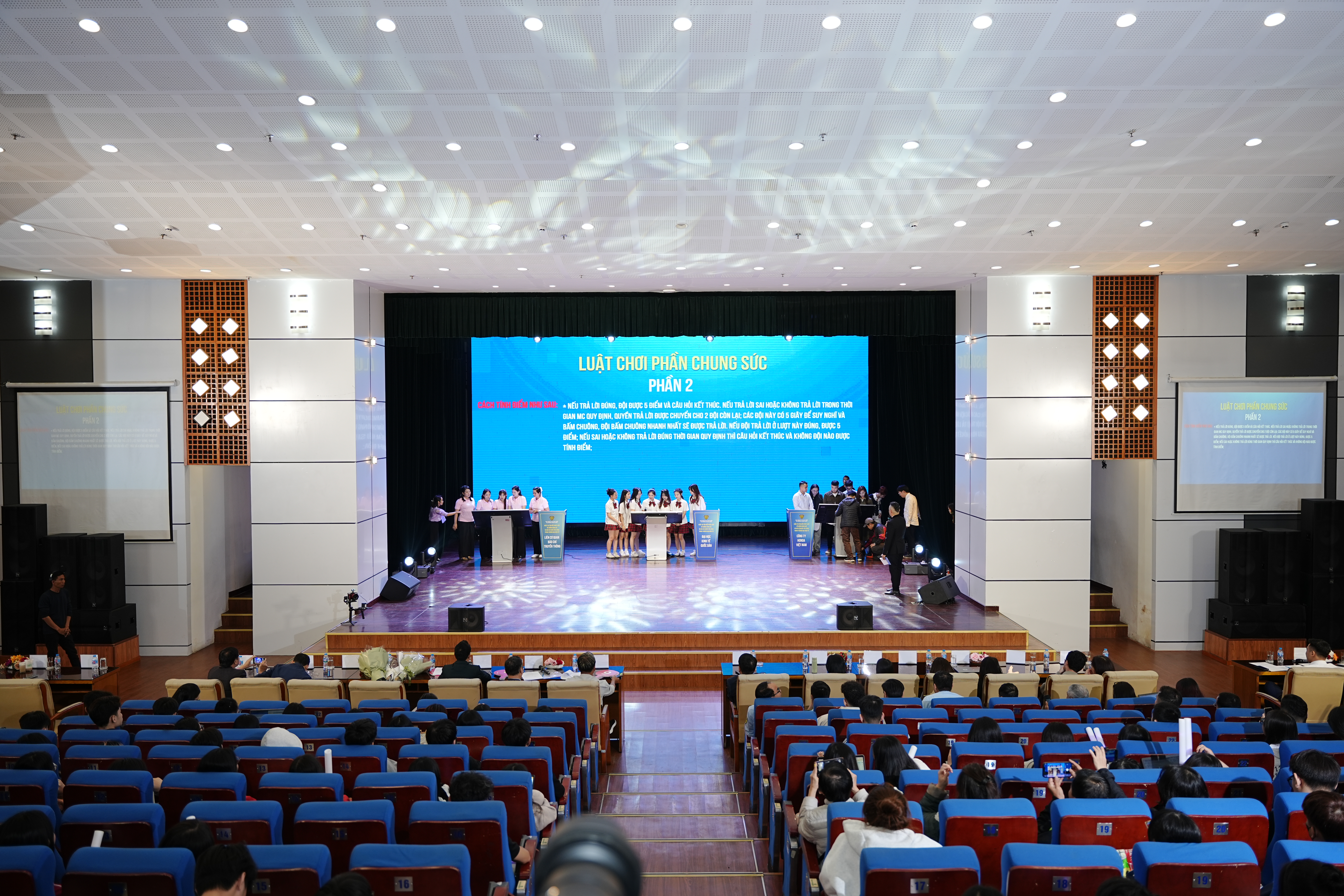 Với sự cổ vũ nồng nhiệt của hàng trăm cổ động viên, các phần thi chính thức của Cuộc thi nhanh chóng “nóng lên” bằng màn thể hiện sôi động của ba đội thi đại diện cho các lực lượng nòng cốt trong đời sống kinh tế – xã hội, gồm đội sinh viên Đại học Kinh tế Quốc dân, đội Liên cơ quan báo chí và truyền thông và đội doanh nghiệp Honda Việt Nam. Mỗi đội mang đến góc nhìn riêng, thể hiện sự chuẩn bị nghiêm túc, kiến thức pháp luật vững vàng và tinh thần thi đấu quyết tâm, tạo nên không khí sôi nổi, kịch tính xuyên suốt các vòng thi.