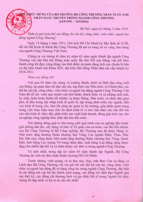 Thư chúc mừng của Bộ trưởng Bộ Công Thương Trần Tuấn Anh nhân 65 năm ngày truyền thống ngành Công Thương