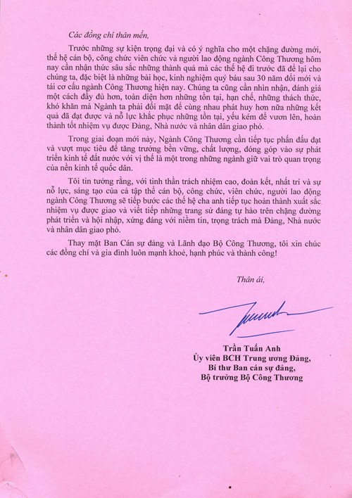 Trước những vinh quang và tự hào của Chặng đường 65 năm ngành Công Thương, thay mặt Ban cán sự đảng, Lãnh đạo Bộ Công Thương, Bộ trưởng Trần Tuấn Anh đã gửi tới các thế hệ cán bộ, công chức và người lao động đã và đang công tác trong ngành Công Thương, đặc biệt là các đồng chí cán bộ lão thành cách mạng, các đồng chí lãnh đạo Ngành qua các thời kỳ, các đồng chí thương binh và gia đình liệt sĩ trong Ngành lời chúc mừng tốt đẹp nhất và lời tri ân sâu sắc nhất.